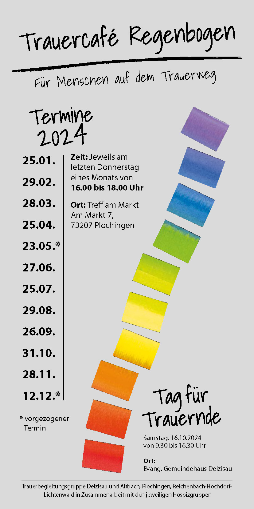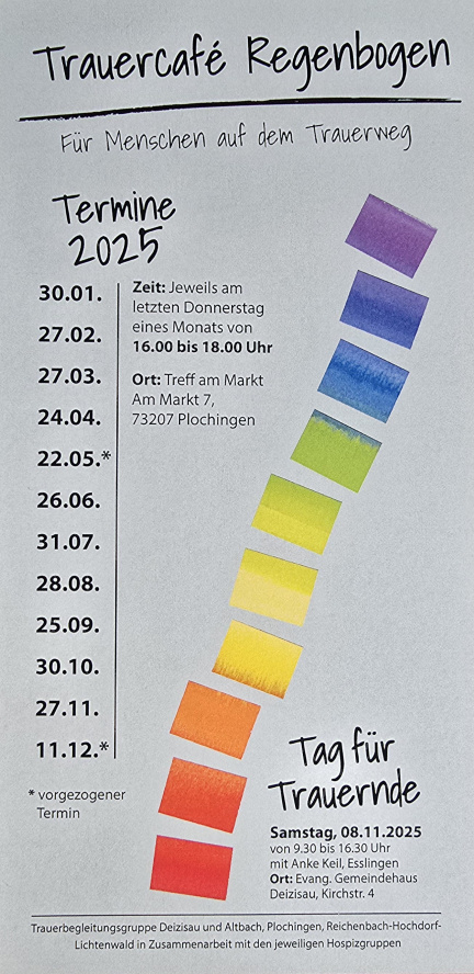 Das Trauercafé Regenbogen findet immer am letzten Donnerstag eines Monats von 16 bis 18 Uhr statt – im Treff am Markt, Marktstr. 7 in Plochingen, direkt gegenüber vom Alten Rathaus. Trauernde Menschen treffen sich zwanglos, um miteinander ins Gespräch zu kommen. Zu diesem kostenlosen Angebot sind alle willkommen, unabhängig davon, wie lange die Trauer bereits anhält.